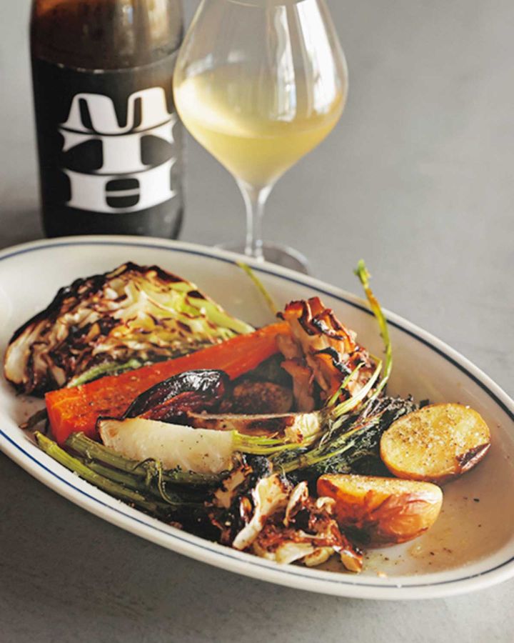 東京郊外から通う後藤さんの地元農家が手掛ける野菜。甘い人参、香り立つ春菊、ほくほくのじゃがいもなど、内容はその日の仕入れ次第。窯焼き野菜盛¥1,980、ワイン(グラス)¥1,320~