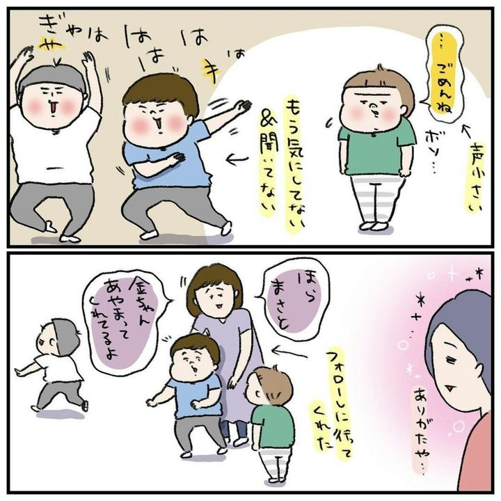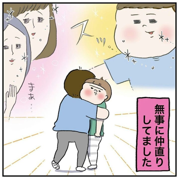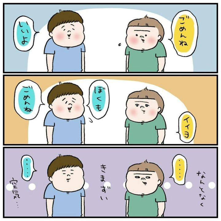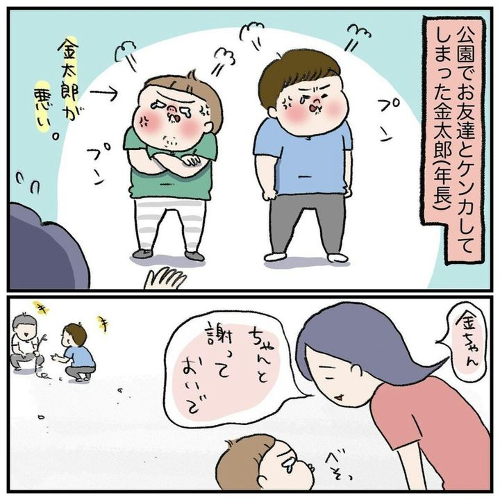 仲直り直後は、照れくさいような気まずいような、何とも言えない空気が流れることもありますよね。公園で友だちとけんかしてしまった、うえだしろこ(@shiroko_u)さんの息子・金太郎くん。謝りに行くも、友だちには聞こえていない様子。友だちのママが間に入ってくれて、もう一度勇気を出して謝ると…。