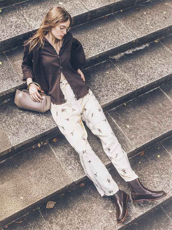 【POINT】柄の色を拾って、トップスや足元、バッグもビターなブラウンを採用。ゆるいシルエットを生かした着くずしたシャツやサイドゴアのブーツのラフな着こなしも、落ち着きはらった配色の中でなら気だるくキレイに着地。