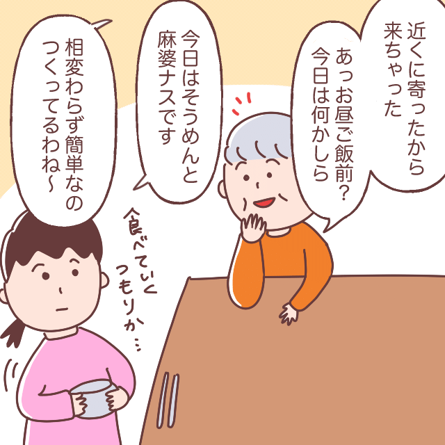 「近くに寄ったから来ちゃった。あっ、お昼ご飯前?今日は何かしら?」悪びれもせずにそう言う義母に「今日はそうめんと麻婆ナスです」と答えるキョウコさん、すると「相変わらず簡単なの作ってるわね~」とすかさずイヤミをチクリ。それを聞いたキョウコさんは「食べていくつもりか・・」と心の中で呟きました。