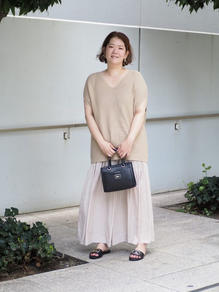 この日、大阪から東京に遊びに来ていた福田さん。同系色のニットトップスとフレアスカートをさらりとまとった楽ちんスタイルで街歩き。「シワになりにくいアイテムなので、旅行仕様のコーデにぴったりかなと。スカートはかれこれ5年ほどはいています」。バッグとサンダルは締め色の黒をセレクト。