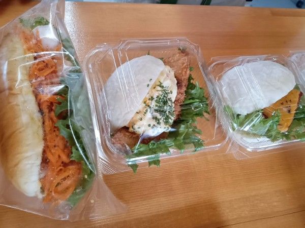 左はキャロットラペのドッグパンですかね、隣は白パンの調理パンのようです。私は甘いものが好きで今回は選びませんでした。次回は違うチョイスもしてみようっと…