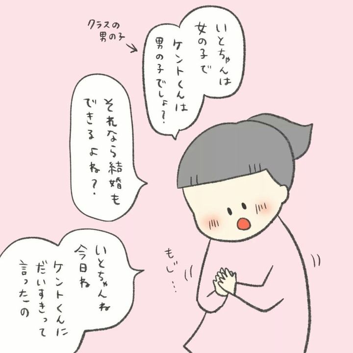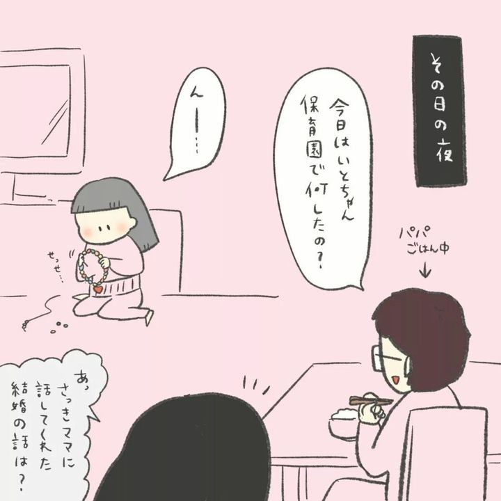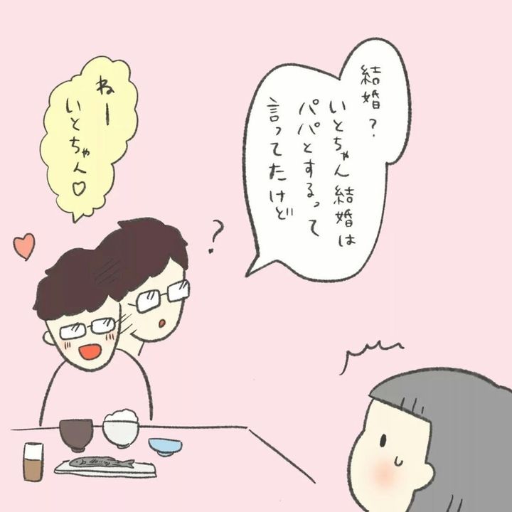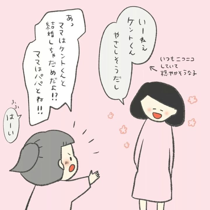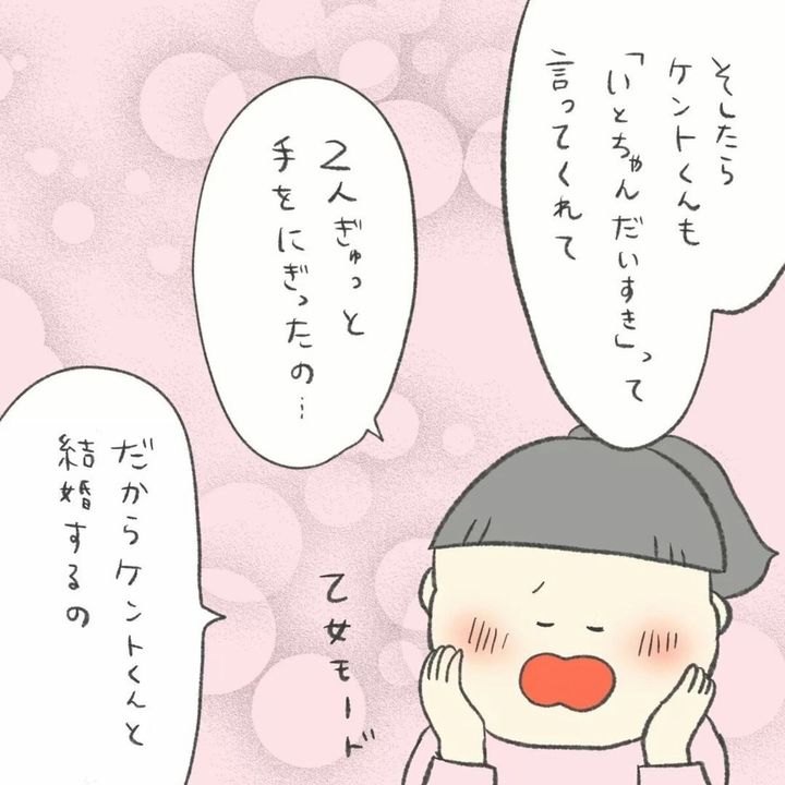 幼稚園の同級生に恋をしているというわさび(@wasabi_2910)さんの娘のいとちゃん。ママと話していた時は「ケントくんと結婚する」と言っていましたが、その日の夜、パパにその話を聞かれると?幼いいとちゃんの気遣いを感じるエピソードをごらんください。