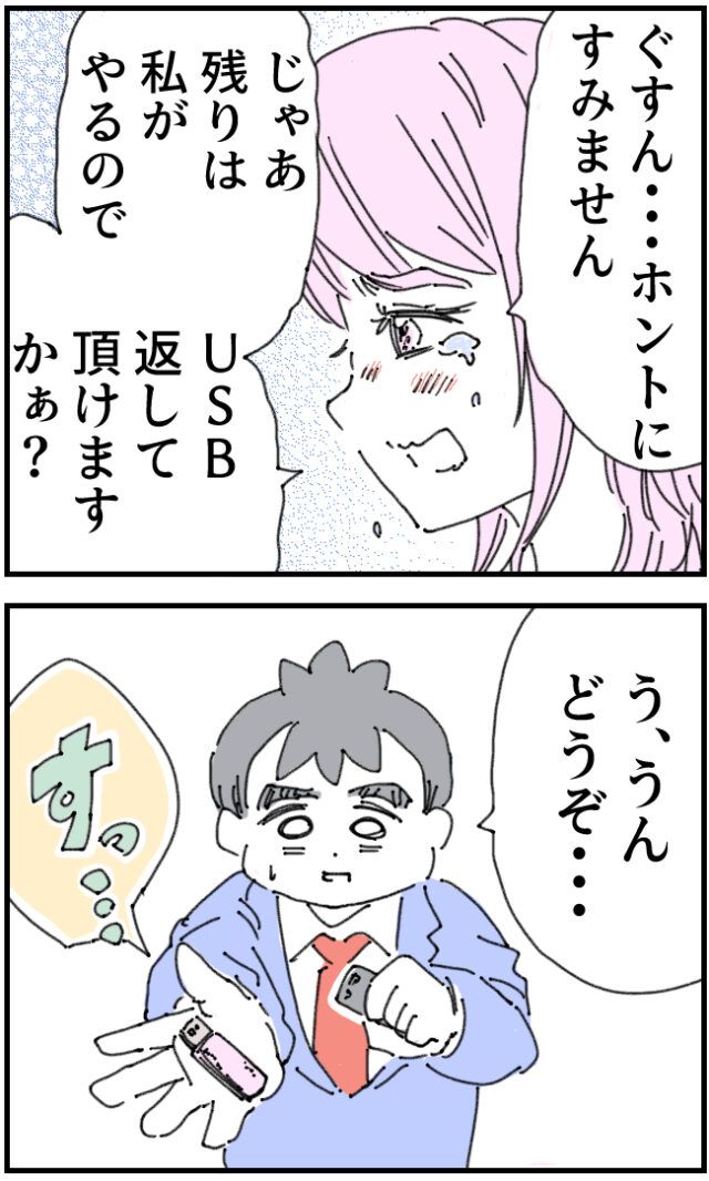 白石さんは「ぐすん・・・ホントにすみません。じゃあ残りは私がやるのでUSB返して頂けますかぁ?」と泣きながら言いました。「う、うんどうぞ」と、持っていたUSBを手渡しで返すいちろうさんです。