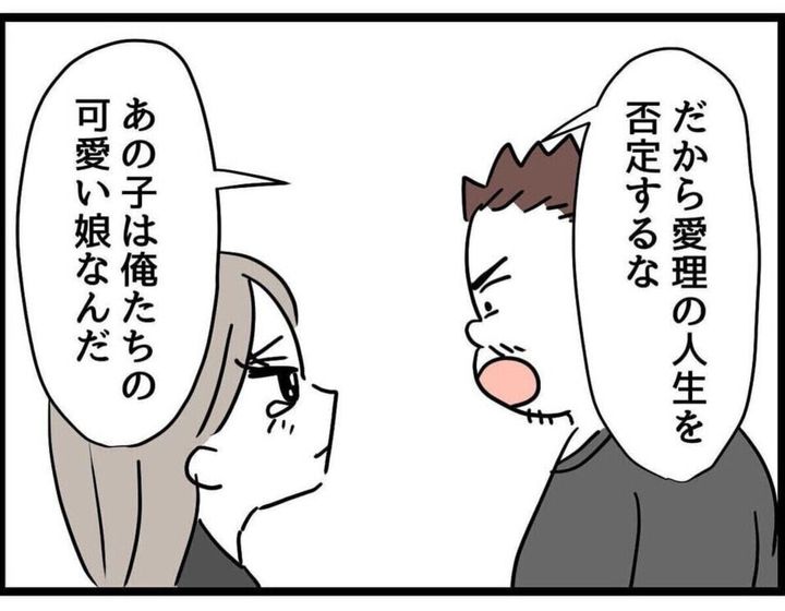 娘の容姿に悩み、ケンカにまで発展してしまった夫婦。主人公は、「娘が大きくなったら整形させる」という発言までしてしまいます。激怒した夫に家を追い出されました。一度、外で頭を冷やし、再び夫と向き合います。
