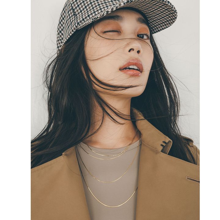 コンサバ服に合わせるなら顔まわりが華やぐ耳元より、洗練された印象を与えるチェーンネックレスを。ミニマルな存在感が今っぽい。上3連ネックレス〈YG〉¥66,000下ロングネックレス〈YG〉¥60,500(ともにココシュニック)キャップ¥18,700(マサカズ フルサワ/UTS PR)コート¥110,000(ハイク/ボウルズ)ワンピース¥19,800(エミ/エミ ニュウマン新宿店)