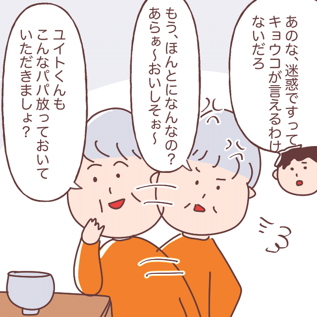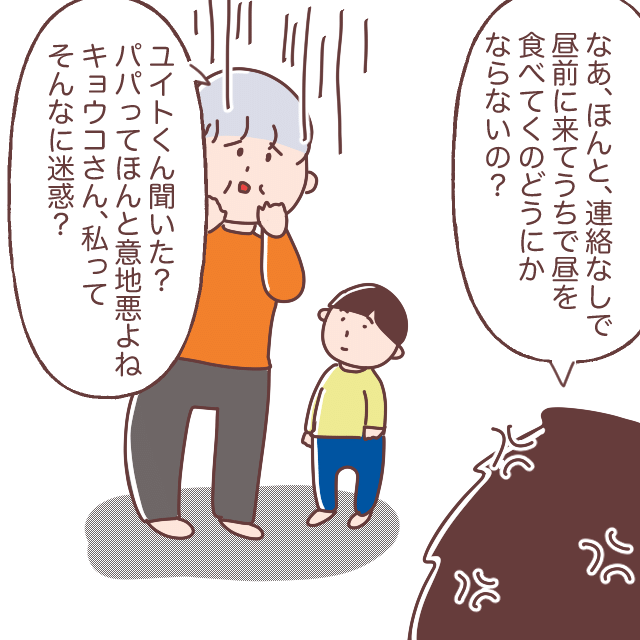 ご主人の言葉を聞いた義母は「なによそれ?せっかく来たのに嫌な言い方!パパ意地悪よね~。ユイトくん、おばあちゃんをいじめるパパなんて嫌い!ってパパに言って」とユイトくんに向かってご主人への不満をぶつけました。すると「ほんと連絡なしで昼前に来てうちで昼を食べてくのどうにかならないの?」と怒りがおさまらないご主人が言うと「ユイトくん聞いた?パパってほんと意地悪よね。キョウコさん、私ってそんなに迷惑?」とキョウコさんにたずねる義母、「あのな、迷惑ですってキョウコが言えるわけないだろ」文句が止まらないご主人に「もう、ほんとなんなの?」と怒りつつ、「あらぁ~おいしそぉ~」とお昼ご飯にシフトした義母は「ユイトくんもこんなパパ放っておいていただきましょ?」とシレっと言いました。
