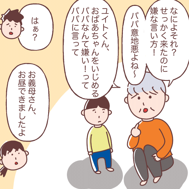 ユイトくんのお勉強について嫌味を繰り返す義母に「そんなこと言いに来たなら帰って欲しいんだけど」とご主人が言うと、「なによそれ?せっかく来たのに嫌な言い方!」と言った後で「パパ意地悪よね~。ユイトくん、おばあちゃんをいじめるパパなんて嫌い!ってパパに言って」と、わざわざユイトくんを経由して文句を言い出す義母に「はあ?」ご主人がうんざりしていると、すかさず「お義母さん、お昼できましたよ」とキョウコさんが声を掛けました。