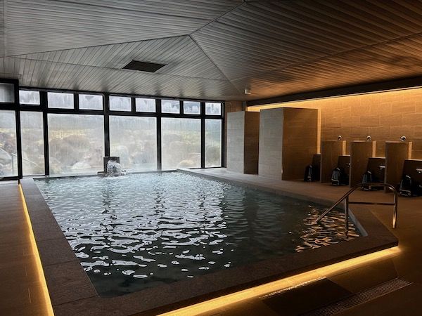 「美人の湯」と言われるナトリウム炭酸水素塩泉で湯汲みを楽しんで。湯上がり後には喉を潤し、ゆっくり寛げる温泉ラウンジも併設されています。