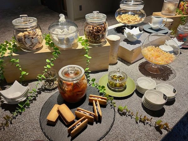 チェックイン後ラウンジでは15時から18時まで、コーヒー・紅茶のほかスパークリングワインやビールなどをお菓子と共に楽しめます(21時から23時は大人時間を過ごせるバータイムに♪)。