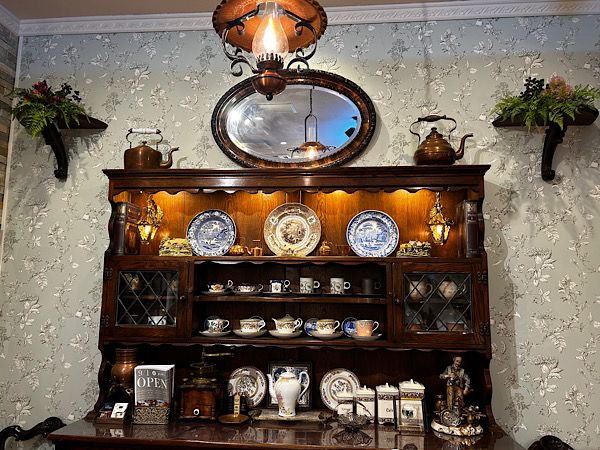 店内には、イギリスのアンティークな食器や家具がズラリ。 色合いや模様が素敵で、どれもかわいい!