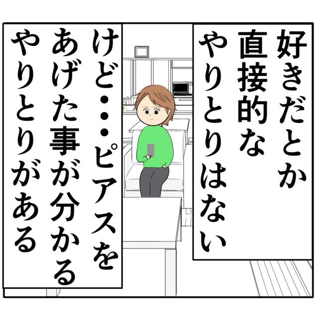 と、その頃すみれさんは、「好きだとか、直接的なやりとりはない。けど・・ピアスをあげた事がわかるやりとりがある」とチャット履歴を見ながら考えていました。
