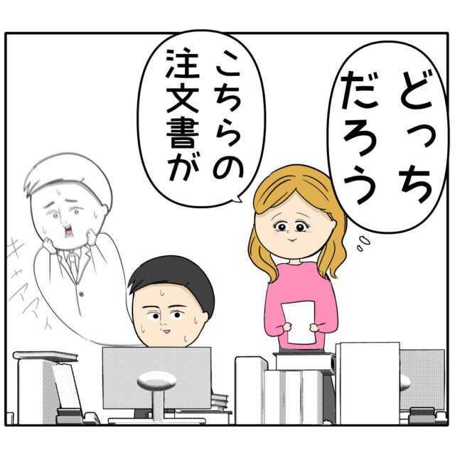 「こちらの注文書が・・」ふり子さんにたずねられ、動揺しながらも対応する良し男さん、対するふり子さんは「どっちだろう」と考えていました。