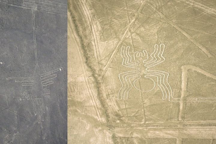 ハチドリとクモの地上絵。ハチドリは96m、クモは46mほどある。/ Credit: ja.wikipedia, canva