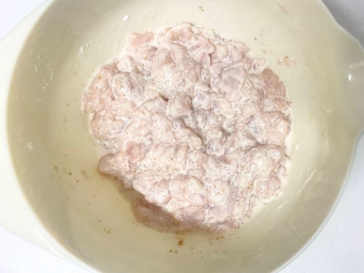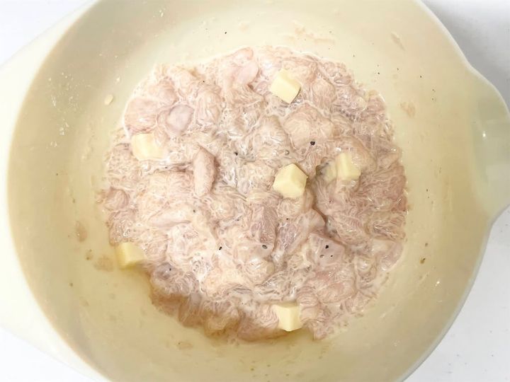1. 叩いた鶏むね肉と[A]をボウルに入れ揉み込み混ぜ合わせます。