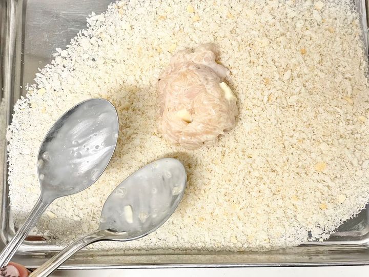 スプーンを2本使い丸く整えてパン粉の上に落としたら、パン粉をつけながら平らな円形にしていきます。
