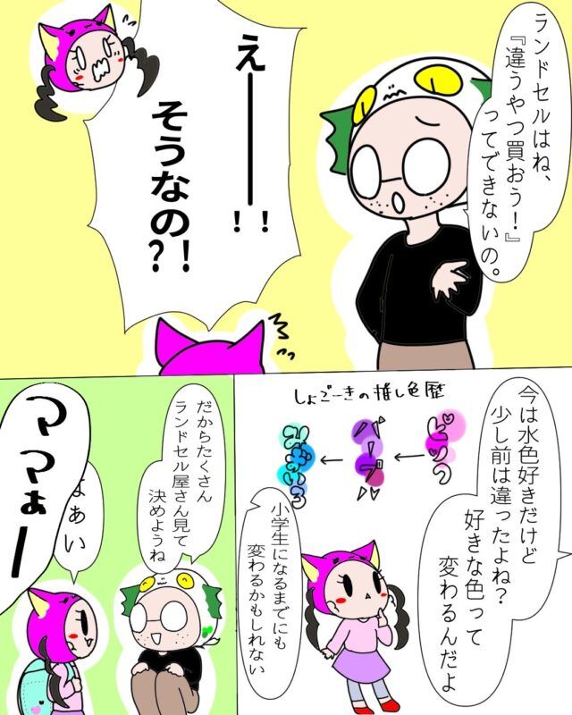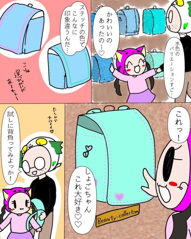 年長さんになって喜ぶしょごーきちゃんを見て「来年には小学生かー」と思い、ハッと気がついたにょろ。さん。すぐご主人ぽろさんに「ラン活しよう!」と持ちかけました。周りから、ギリギリだと欲しい色やメーカーのものがなくなるとか、入学式に間に合わないという理由も聞きつつ、しょごーきちゃんに6年間使う大事なランドセルを『自分で選んで]もらいたいと思っていたにょろ。さん、しょごーきちゃんに伝えると「しょごちゃん選んでいいの!?水色がいい!」と喜ぶ姿を見て、正式にラン活を始めることになりました。