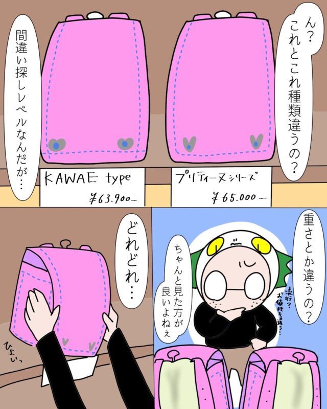 これにする。大量のランドセルから即決する娘に6年間一途でいることの大変さを諭す。娘のラン活[2]|にょろ。の育児日記