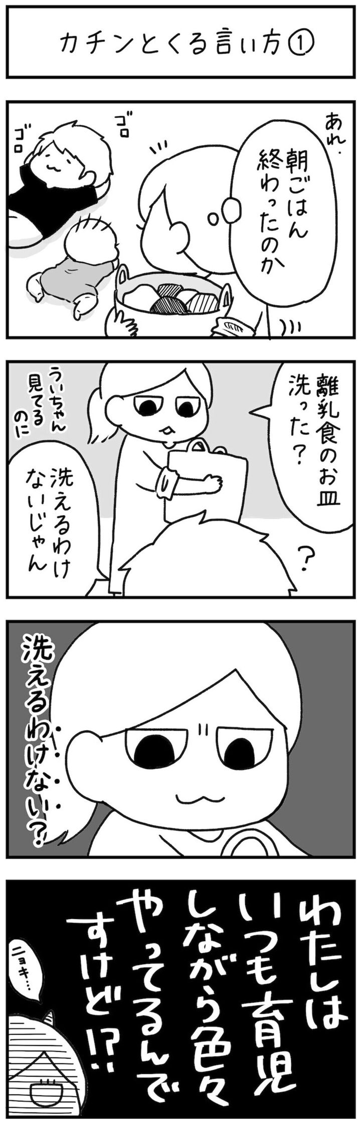 いつものように慌ただしく家事をこなしていたやき子さん。ふと夫と子どもがゴロゴロしている様子が目に入ります。朝ごはんを食べ終わったのか、そう思ったやき子さんは軽い気持ちで「離乳食のお皿洗った?」と夫に尋ねますが、返ってきた言葉が思った以上にカチンとくるもので…?やき子さんの漫画『カチンとくる言い方①』をどうぞごらんください。