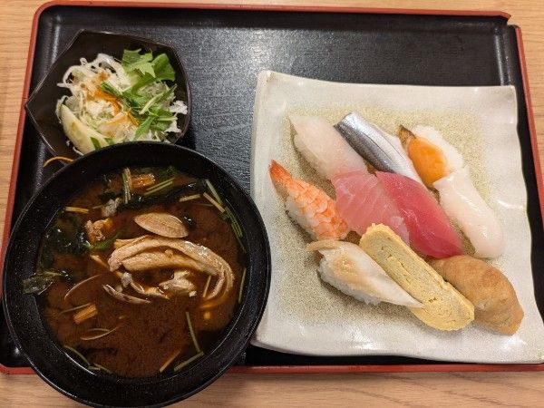 さて、念願の20食限定ランチとご対面! 「お寿司10貫+赤だし又はうどん+サラダ」これで550円! 驚きです。