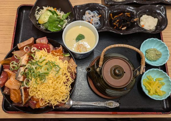 まずは「数量限定!!漁師丼ランチ」950円。小鉢とサラダ付き。こちらも数量限定で、ある日とない日があるそうです。私が訪問したときは”ある日”でした!めっちゃうれしい☆