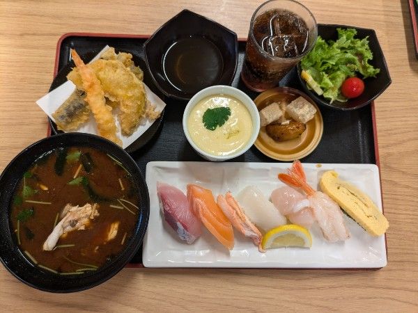 そしてお次は人気の「レディースセット」1100円。「日替わりにぎり7貫+赤だし+茶わん蒸し+てんぷら+デザート+ドリンク」のセットです。天ぷらは揚げたて。とっても美味しかったです!