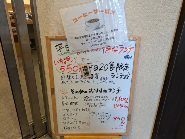 また、平日550円以上注文すると食後のセルフコーヒー付き。至れり尽くせりですね。このランチを求めて行列ができる理由、うなずけます。