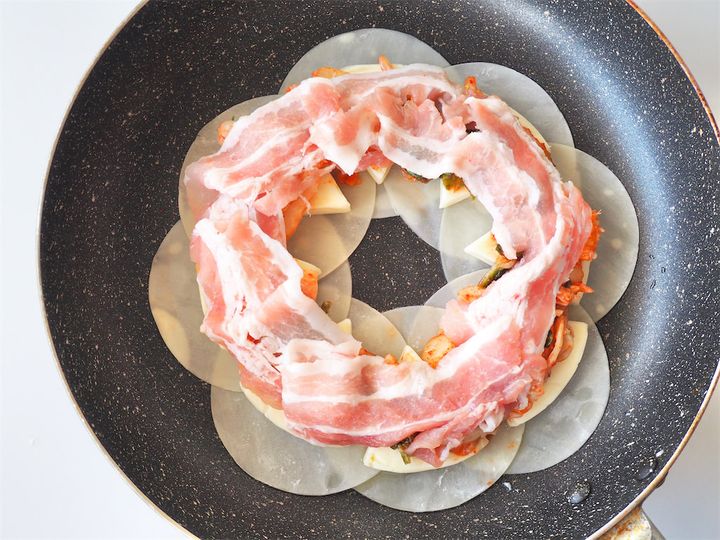 の上にキムチ、豚肉と順に重ねていく。