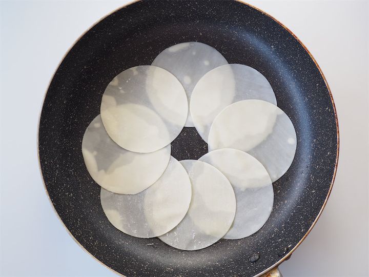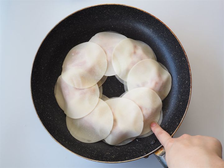 2. 餃子の皮を8枚、軽く重ねながら円を描くように並べる。