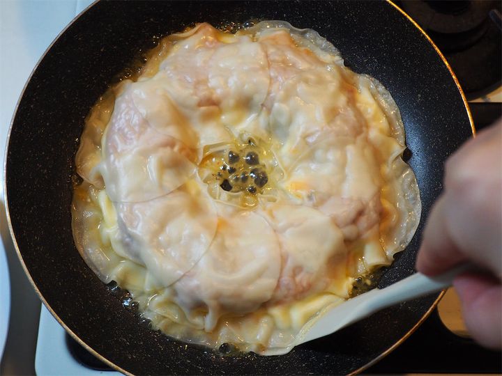 5分経ったらフタを外し、水分を飛ばすように2分ほど焼いていく。表面がカリッとなるまで焼いたらフチを剥がして、お皿にフライパンをかぶせるようにしてひっくり返し、盛り付ければ完成。