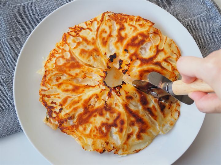 ピザカッターで切ると、パリパリと響き渡るおいしそうな音♪食べてみると、表面はパリパリで下の皮はもちもちした食感で、餃子の皮のいいところを最大限に活かしています。シャキシャキのキムチの辛さをとろりチーズがまろやかにしてくれ、どちらともの旨味をぎゅっと味わえる上、さらに豚肉の甘みと旨味がおいしさに追い打ちをかけてきます。キムチ餃子っぽくも、ピザっぽくもある。そして、プロセスチーズでもこんなにとろとろになることを初めて知り驚きました。