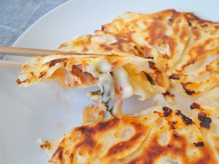 パリパリもちもち!キムチ餃子っぽくも、ピザっぽくもある味わい