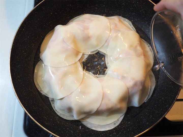 6. 全部を並べた5のフライパンを中火にかける。温まったらフライパンのフチから水を回し入れ、フタをして中火弱で5分蒸し焼きにしていく。