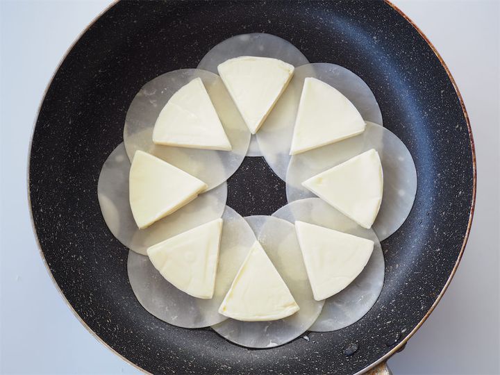 3. 2の餃子の皮の上にチーズを乗せる。