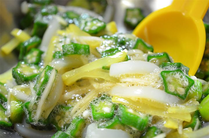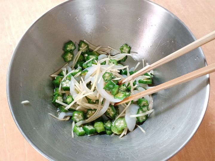 オクラのねばりと麺のツルツルとしたのど越しで、食欲がない時もスルっと食べられそうな一品に仕上がります。