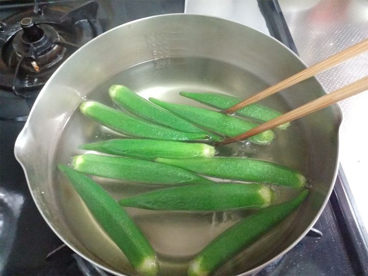 塩で板ずりしたら、熱湯でさっと色が変わるまで茹でましょう。