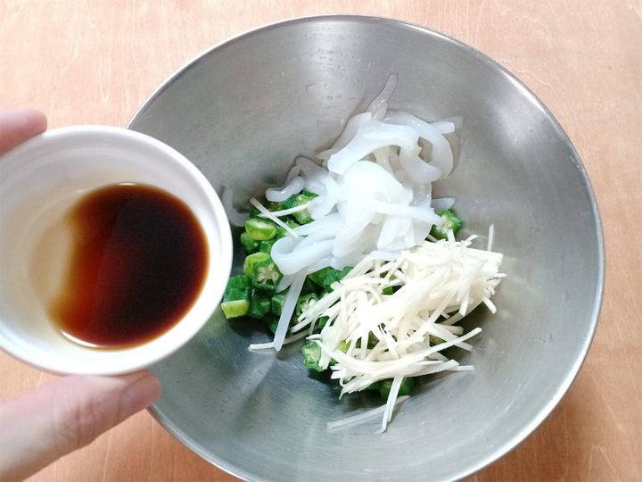 2.千切りにした新しょうがと1のオクラ、イカをボウルに入れ、めんつゆで和える。