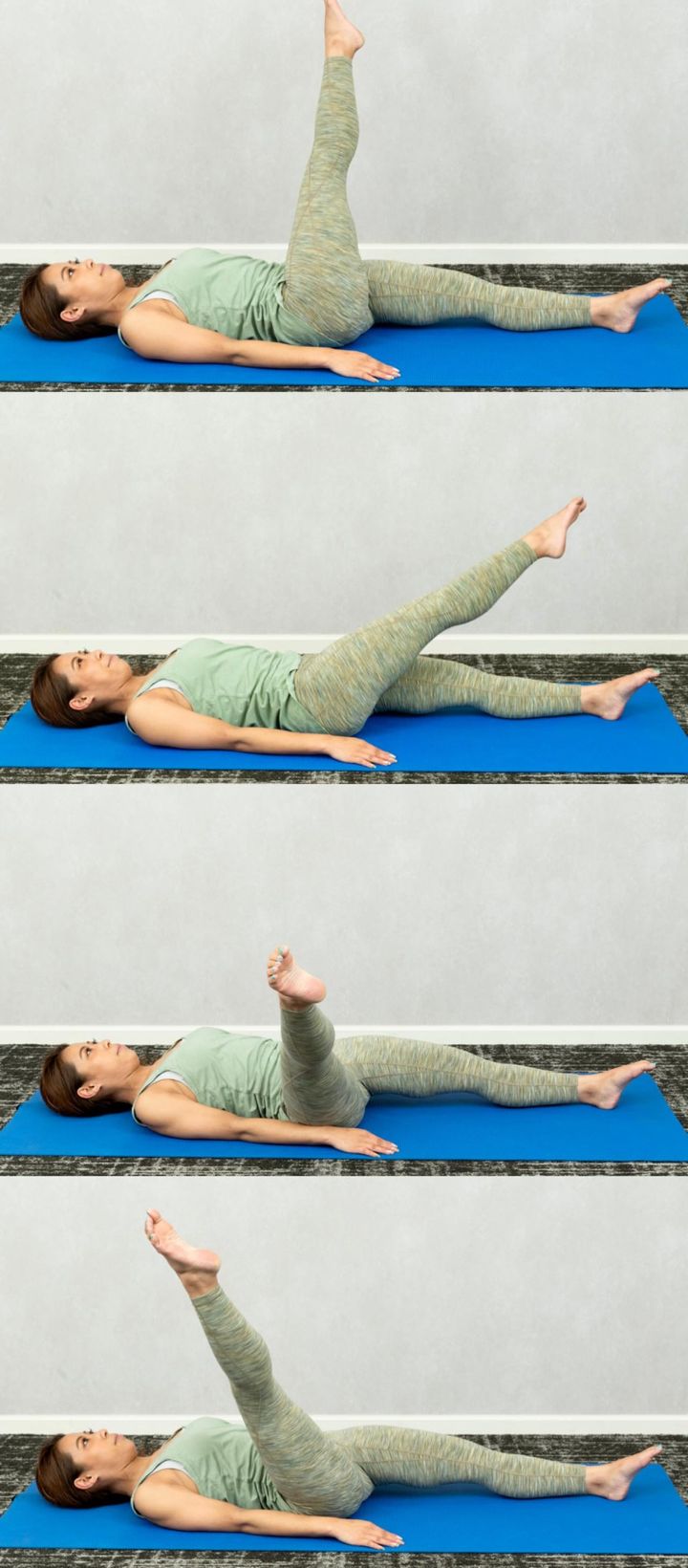 (2)右脚を天井方向にまっすぐ上げ、時計回りに大きく回す ※5回繰り返す