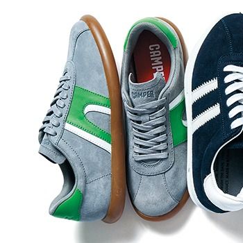 グレースニーカー/カンペールジャパン スムースなスエード地。同じグリーンでも渋い色みと明るい色みで、トーンを変えずに奥行きを創出。つま先からかかとにかけて湾曲したラウンドフォルムが、カジュアル色の強いガムソールをモードに傾ける。