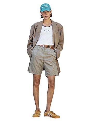 上下のベージュともなじみのいい深いイエローのスニーカー。ジャケットをハーフパンツでくずしたカジュアル感を引き継ぎながら、かっちりしたローファーや色がぱきっと出てしまう黒白スニーカーでは出せない軽快さを獲得できる。