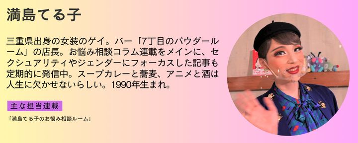 満島てる子:オープンリーゲイの女装子。北海道大学文学研究科修了後、「7丁目のパウダールーム」の店長に。LGBTパレードを主催する「 さっぽろレインボープライド」の実行委員を兼任。 2021年7月よりWEBマガジン「Sitakke」にて読者参加型のお悩み相談コラム【てる子のお悩み相談ルーム】を連載中。お悩みは随時募集しています。