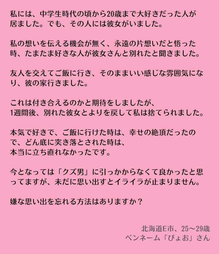今回は、そんな最悪な恋のフラッシュバック的なものに苦しんでいる方からのお手紙みたい。読んでみましょう。