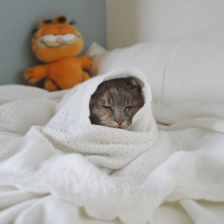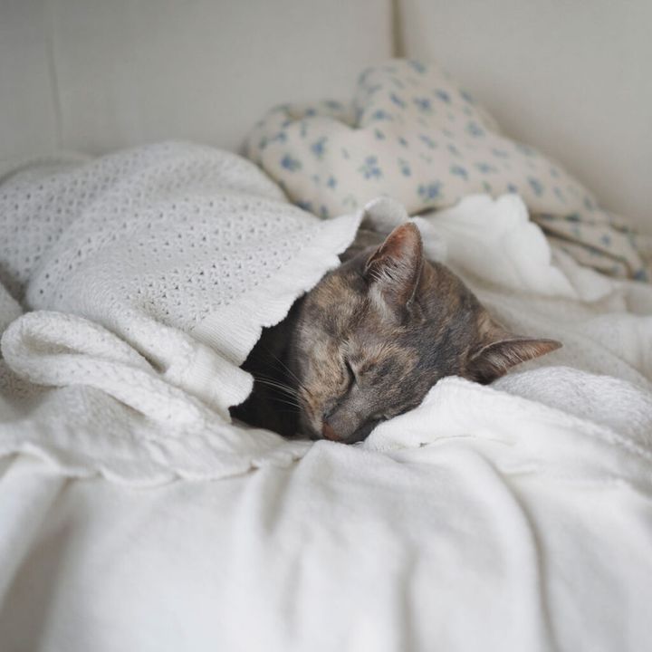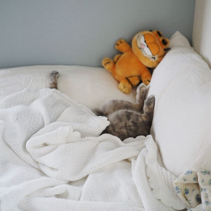 かいぬし「あら! もぷちんったら、いつの間にかひっくり返って、ヘソ天で寝ちゃったの? ゴロゴロカミナリさんに、おへそ取られちゃうわよ!」