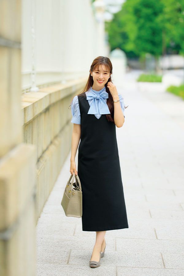 美シルエットで生地にハリのあるジャンスカは社会性抜群。胸元から大ぶりのリボンタイをのぞかせれば、顔まわりがパッと華やかな印象に♡