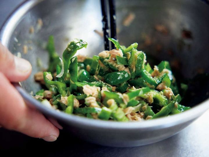 行列のできる定食屋・菱田屋の5代目店主・菱田アキラさんに教わったあっという間にでき上がる簡単つまみ、それが無限ピーマン。「おいしく作るコツは、ピーマンにさっと熱湯をかけて少しだけしんなりさせること。しっかり水けを取ったら、あとは味をからめるだけだからほんとに簡単。おすすめだよ」とのこと。さっそくレシピを教えていただきましょう!
