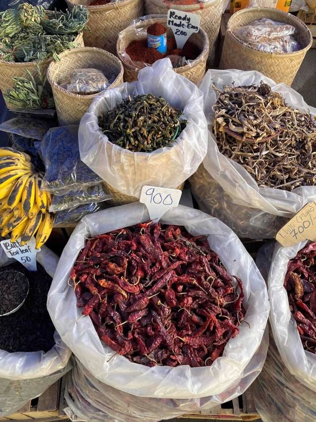 野菜は日本のものよりすべてが小ぶり。宗教上、殺生をしない国民性名ながらインドから輸入した干した魚やソーセージなどを扱う店も。南部のインド国境地帯は温暖なため、国産トロピカルフルーツもそろっています。