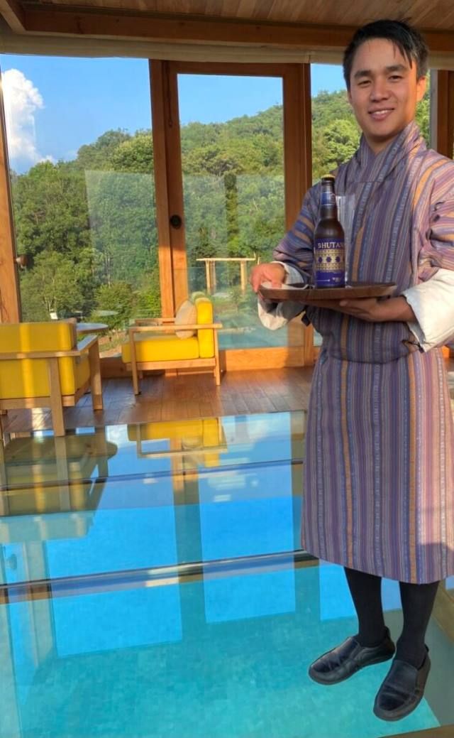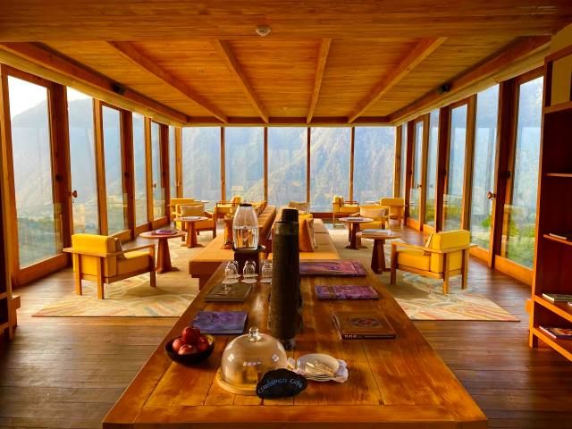 ヒマラヤの山々を一望できるガラス張りのラウンジはインフィニティプールが突き出ているような設計。ガラス張りの床の下は水が張られているため、まるで水の上に浮いているかのような浮遊感を味わえます。