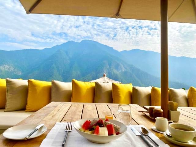 世界の屋根であるヒマラヤ山脈を望みながらの朝食は格別! これこそ異次元の光景です。