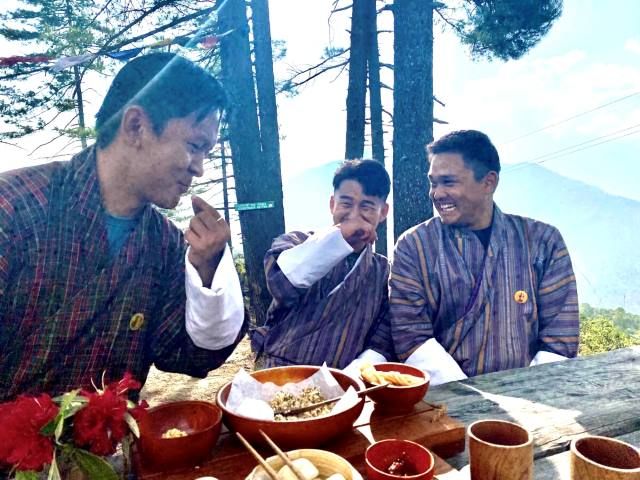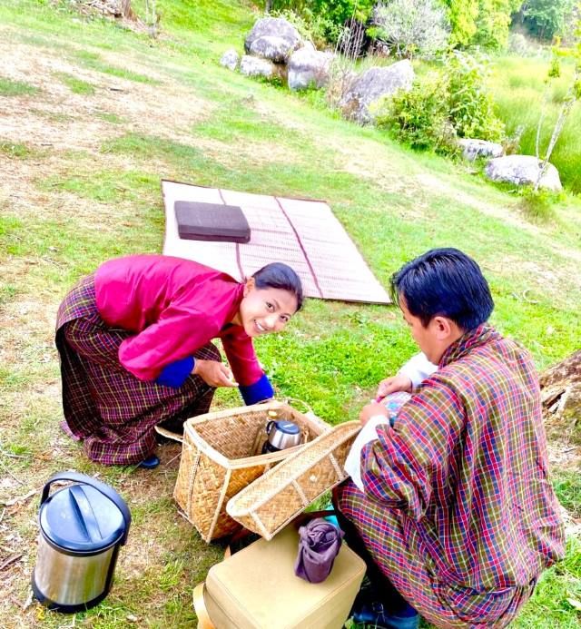 澄んだ空気のヒマラヤの自然のなかで、ブータン流お弁当を満喫