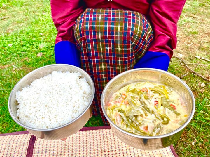 用意されたお弁当は、ランチボックスに入ったブータンのソウルフード、唐辛子のチーズ煮込み、エマ・ダツィ。ヒマラヤの空気を吸い込みながら、緑あふれる森のなかのピクニックランチは格別です。